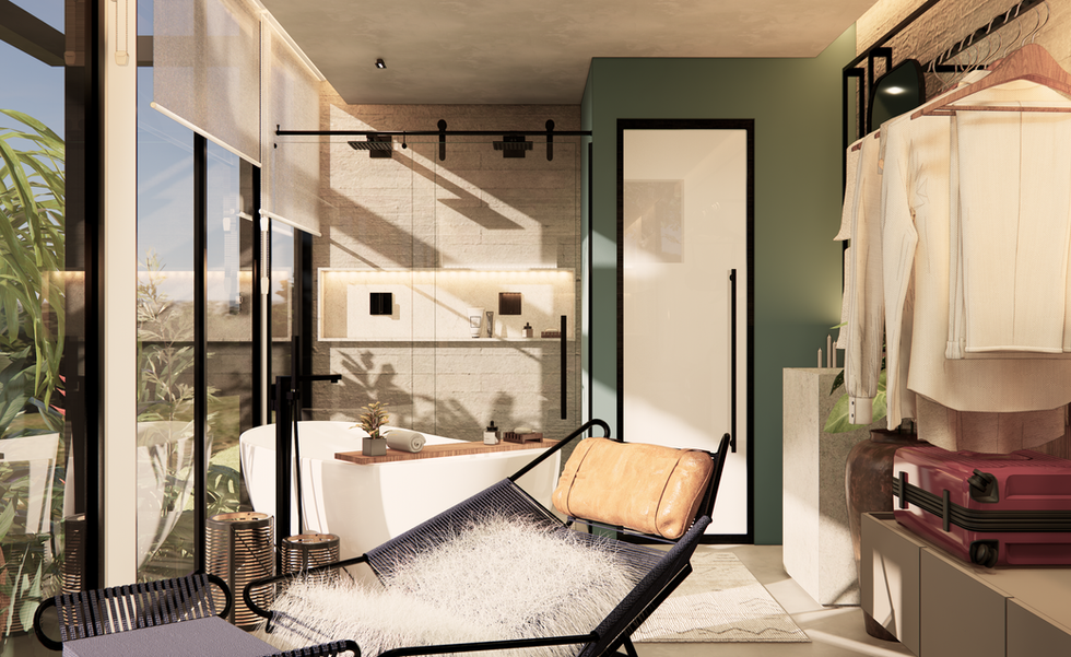 Paredes internas revestidas com MDF cor Floripa da Sudati; :: Parede interna banheiro com placa vínilica texturizada;